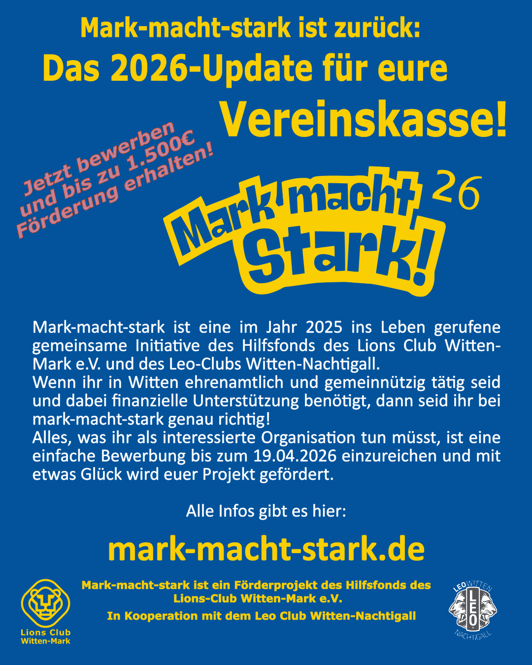 Hilfsfonds des Lionsclubs Witten Mark, IBAN DE95 4306 0129 0001 0997 01, BIC GENODEM1BOC